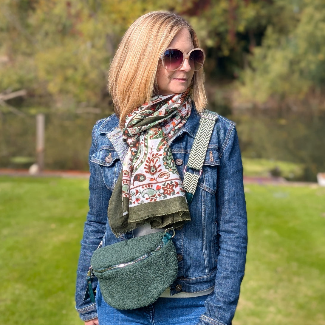 This plush green crossbody bag is eye-catching and comfy, pairing bold colour with everyday practicality. A great go-to bag for autumn walks, festive markets, and more.