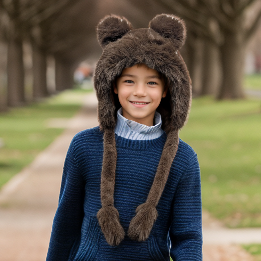 This dark brown faux fur bear hat combines cosy warmth with a playful animal-ear design. Long ties and pompoms make it both fun and practical for winter days.