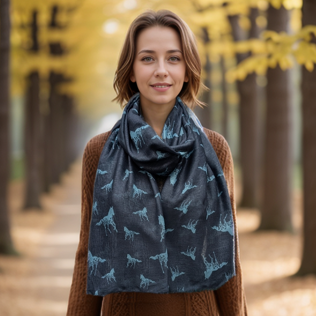 The Floral Horse Scarf captures the beauty of motion and nature in one stylish piece. With floral silhouettes forming the shape of trotting horses, this scarf is a gentle nod to countryside charm and artistic design. Lightweight, wearable and full of character.