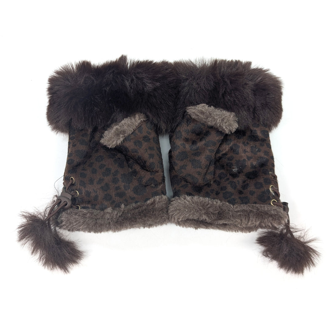Cosy yet bold, these dark brown animal print fingerless gloves combine soft suede effect fabric with warm faux fur accents. The pompom cord detail ensures a secure fit while adding a fun, fashionable flourish.
