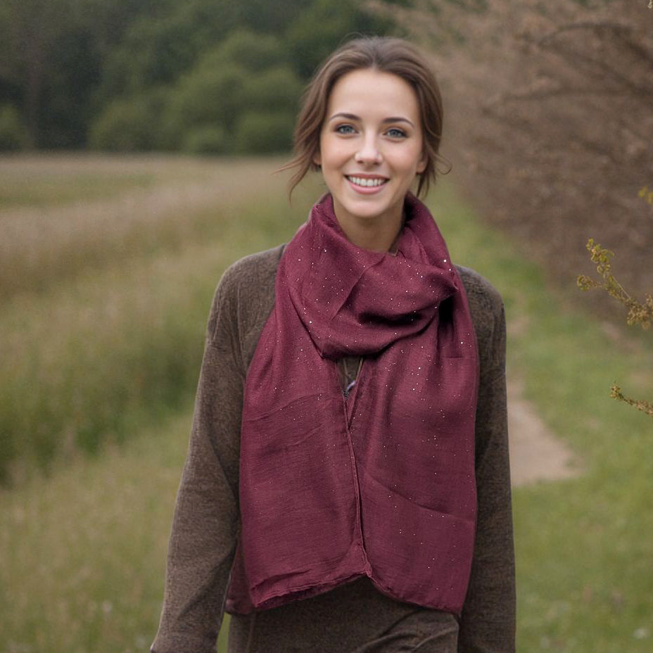 The Viano Sparkle Scarf in Dark Red delivers depth and sophistication, finished with a graceful shimmer.