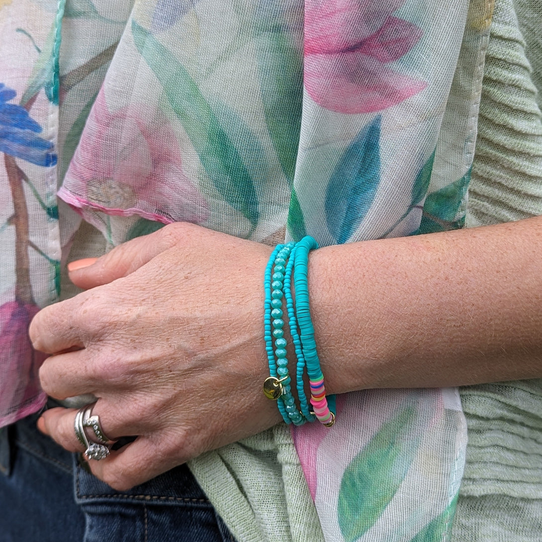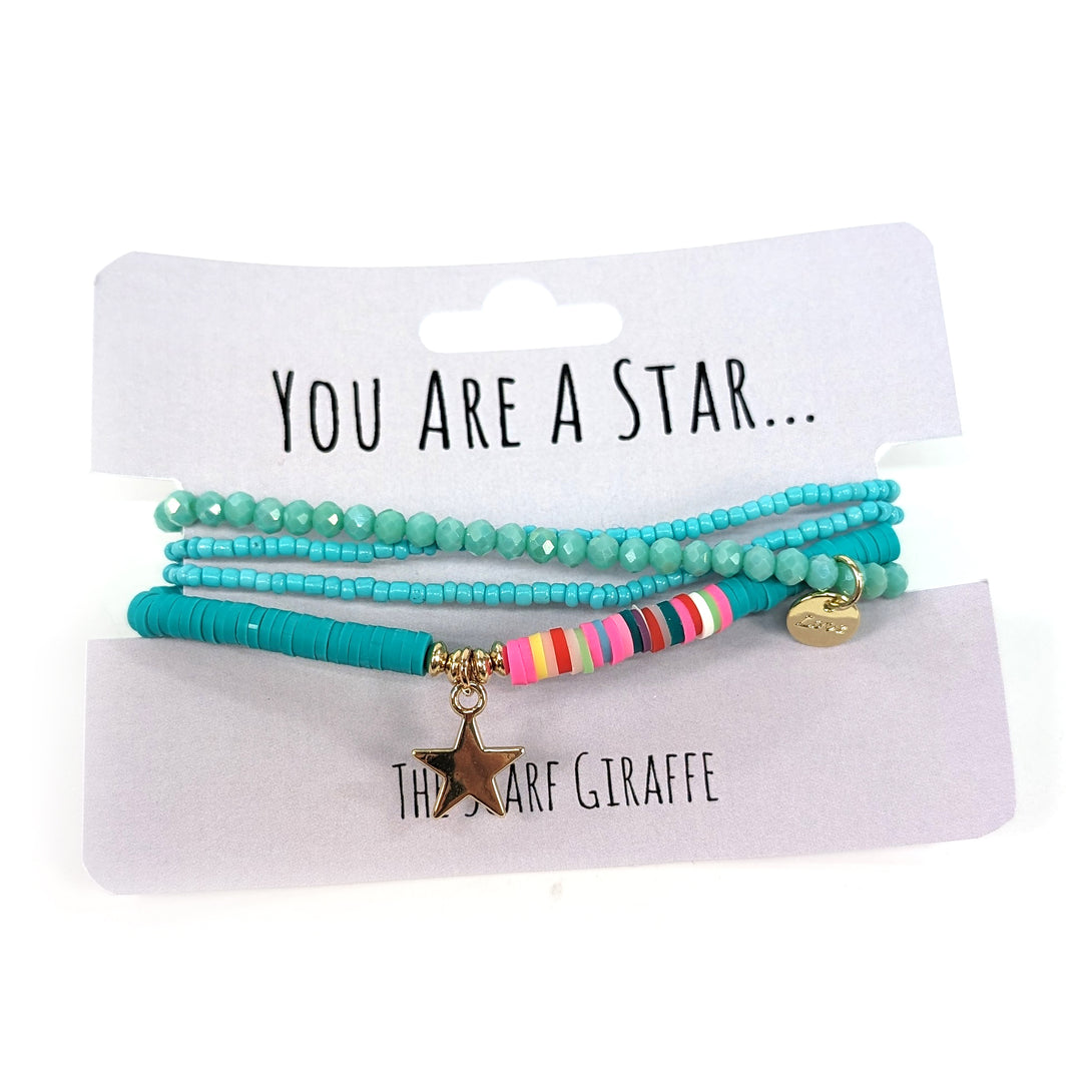 Elevate your look with our Turquoise Bracelet Set, a stunning collection of four bracelets that are sure to make a statement. Presented on a card adorned with the lovely words 'You Are A Star', this beautiful set is perfect for adding a touch of glamour to any outfit. Whether worn together as a set or individually, each bracelet in the set complements the others in style and color, creating a cohesive and harmonious look that is perfect for both casual and special occasions. The set includes a variety of bracelet styles, including iridescent crystals with a golden 'Love' pendant, elegant seed beads, and clay discs with a golden star pendant. The clay disc bracelet features a rainbow of discs to the side of the golden star pendant, providing a colorful contrast to the main turquoise color. Treat yourself or someone special to our Turquoise Bracelet Set and shine bright wherever you go.